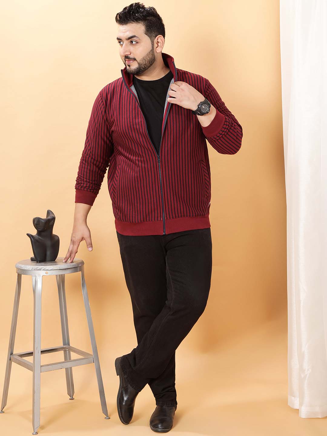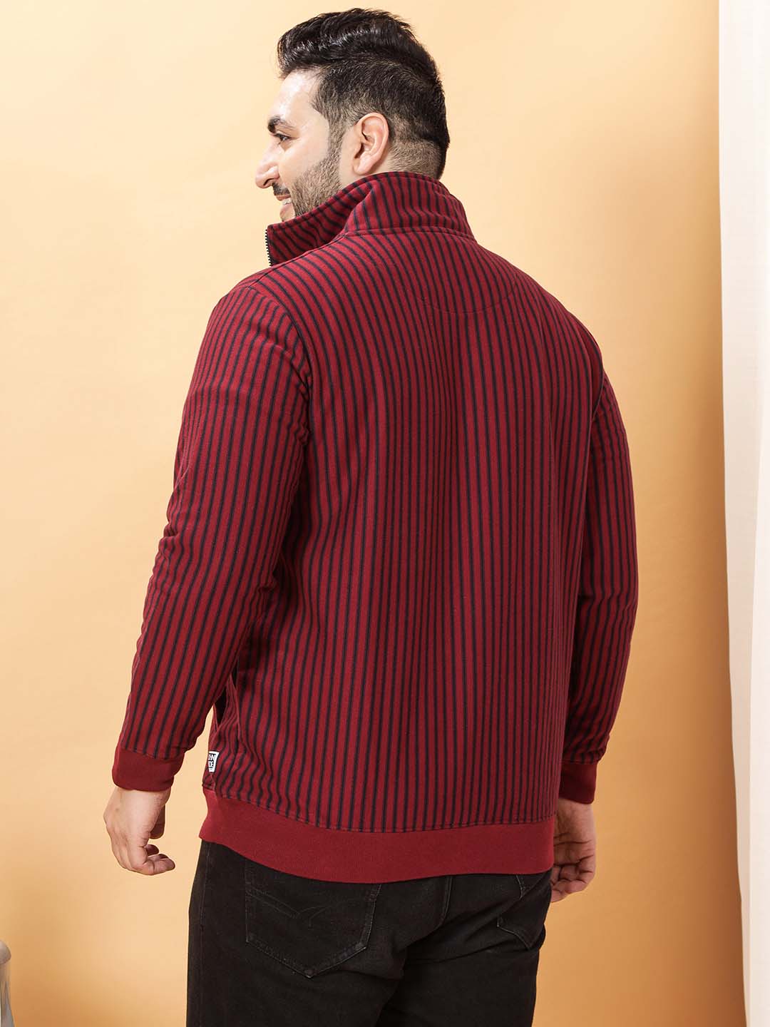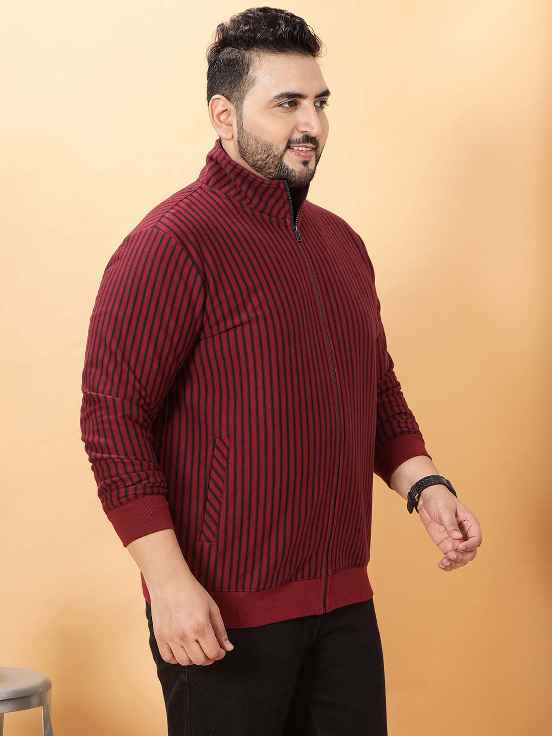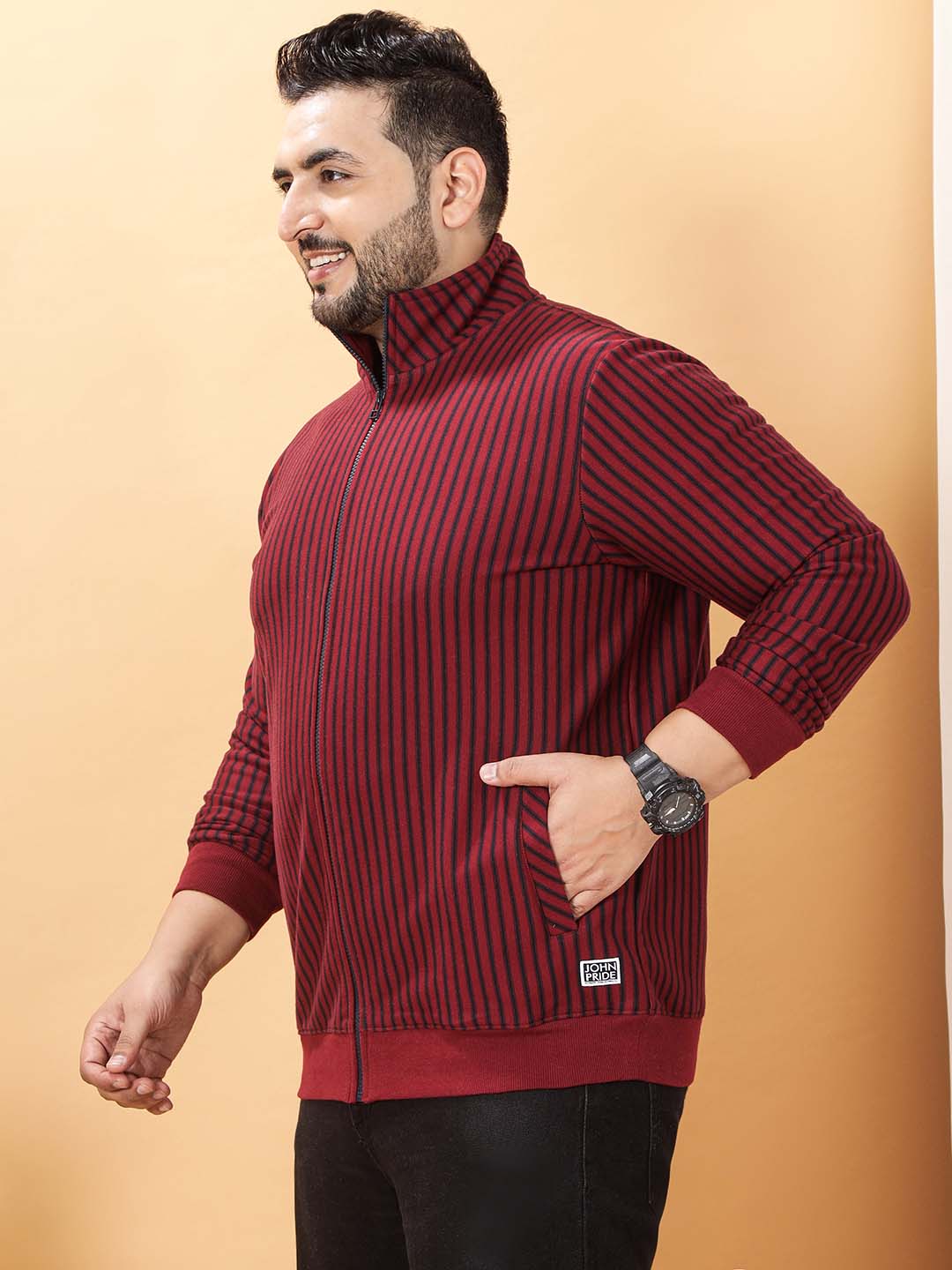 This maroon sweatshirt with navy stripes is crafted from soft fleece fabric, designed to provide warmth and comfort. It features a stylish collar zipper with a matching navy zipper for a coordinated look. The ribbed cuffs and bottom hem ensure a snug fit that stays in place during wear. Concealed pockets offer a sleek appearance while providing practical storage space. Combining classic color-block stripes with modern functional details, this sweatshirt is perfect for everyday casual wear or layering in cooler weather.