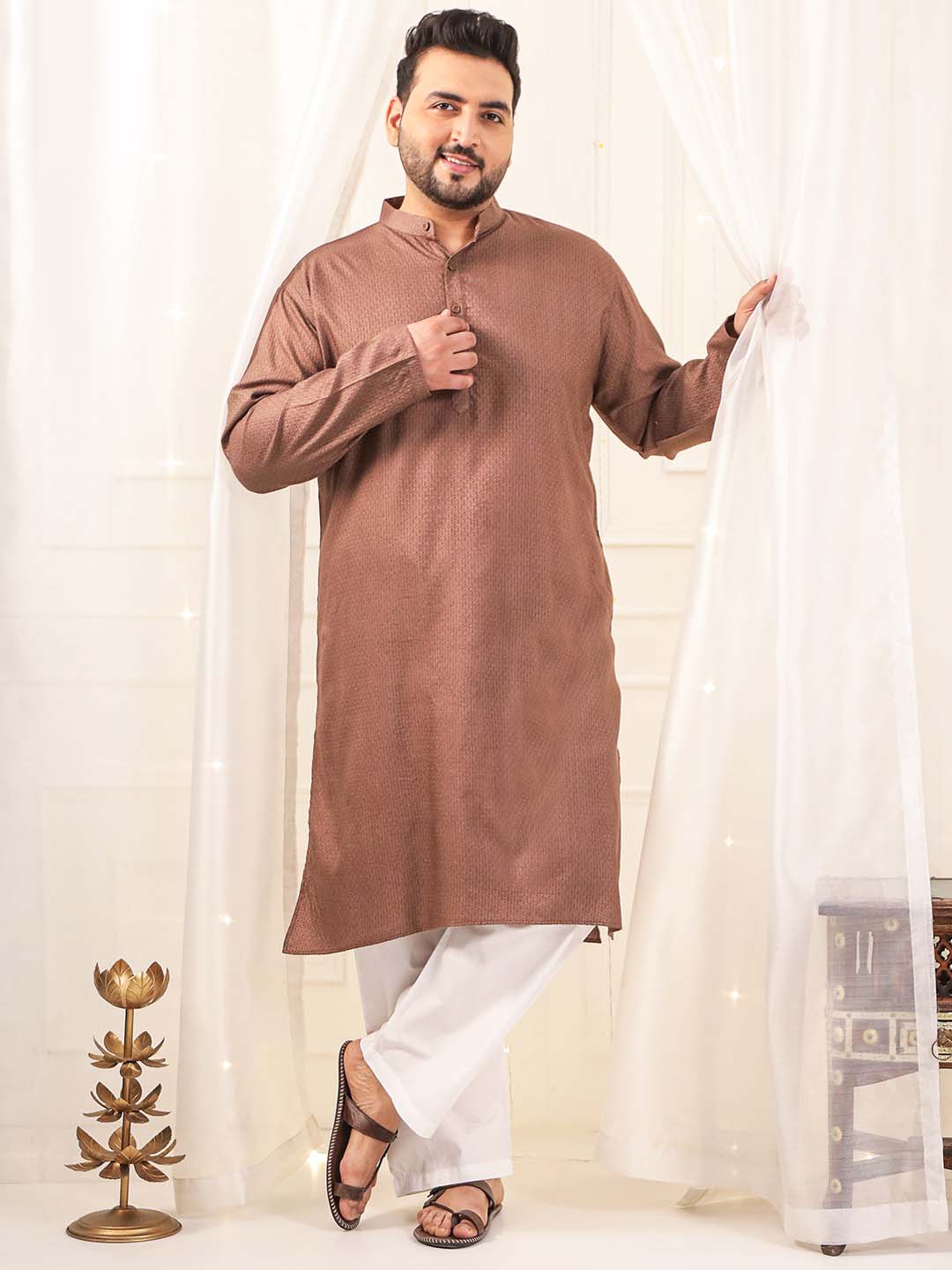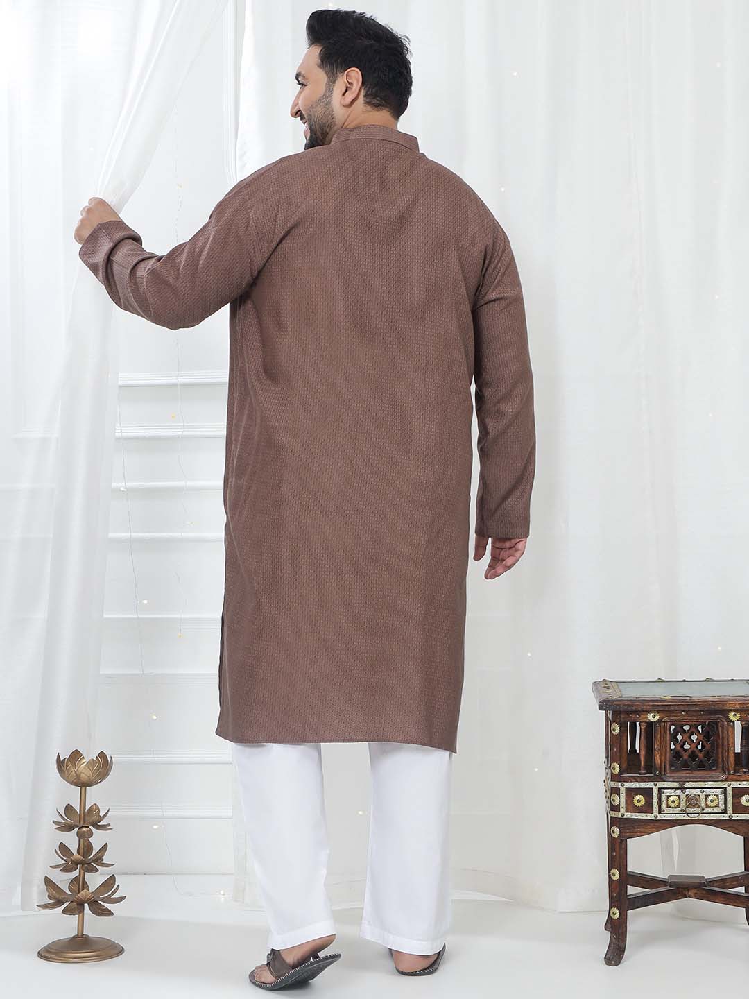This brown kurta features an elegant jacquard pattern woven into rich satin fabric. The smooth, glossy finish gives it a royal and polished look. Comfortable, lightweight, and perfect for festive and ceremonial wear. A premium piece that blends traditional charm with modern sophistication.