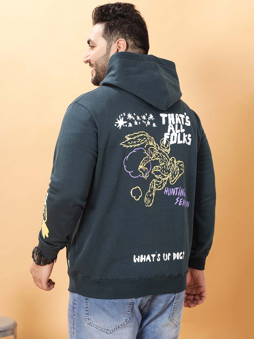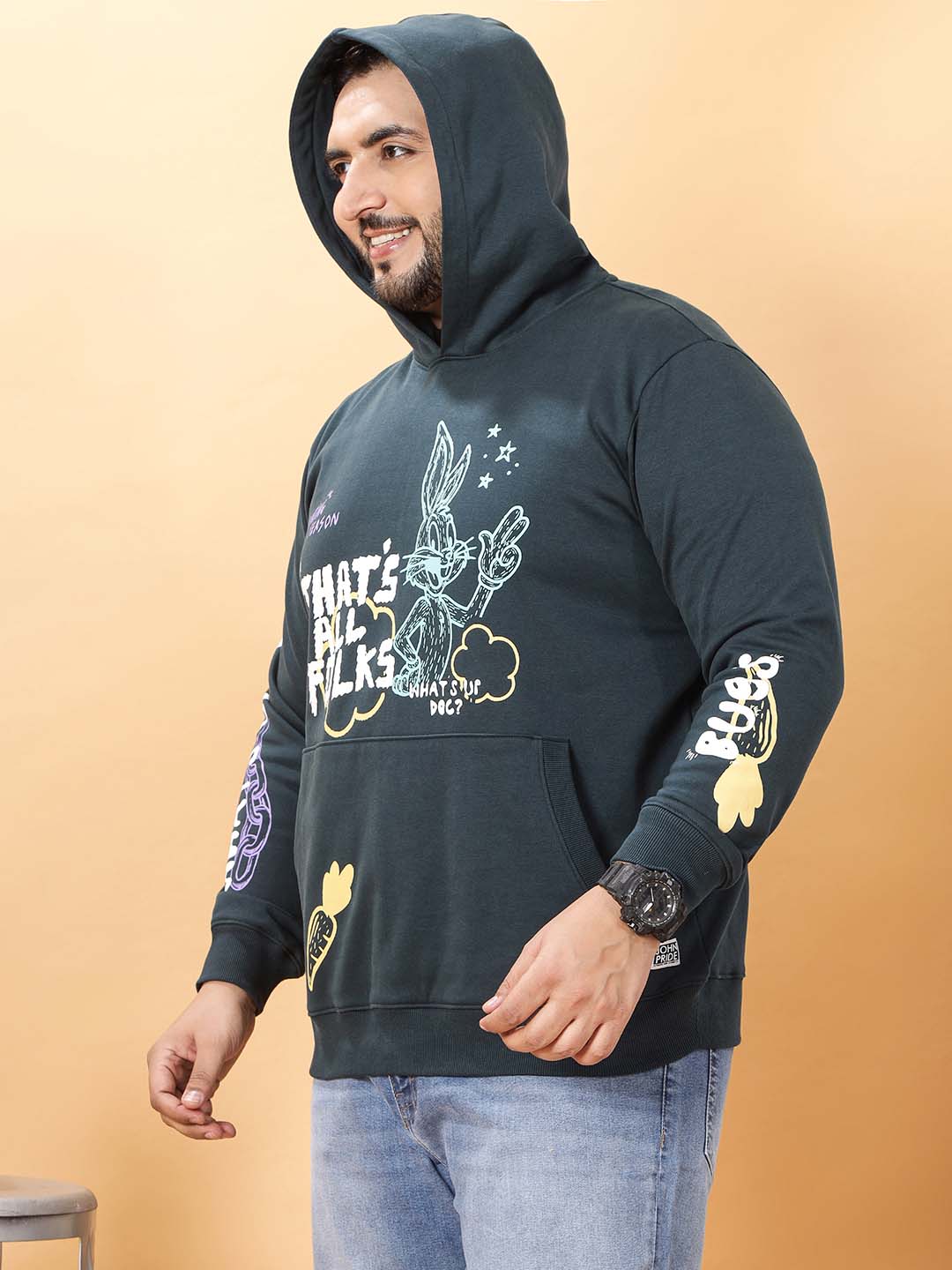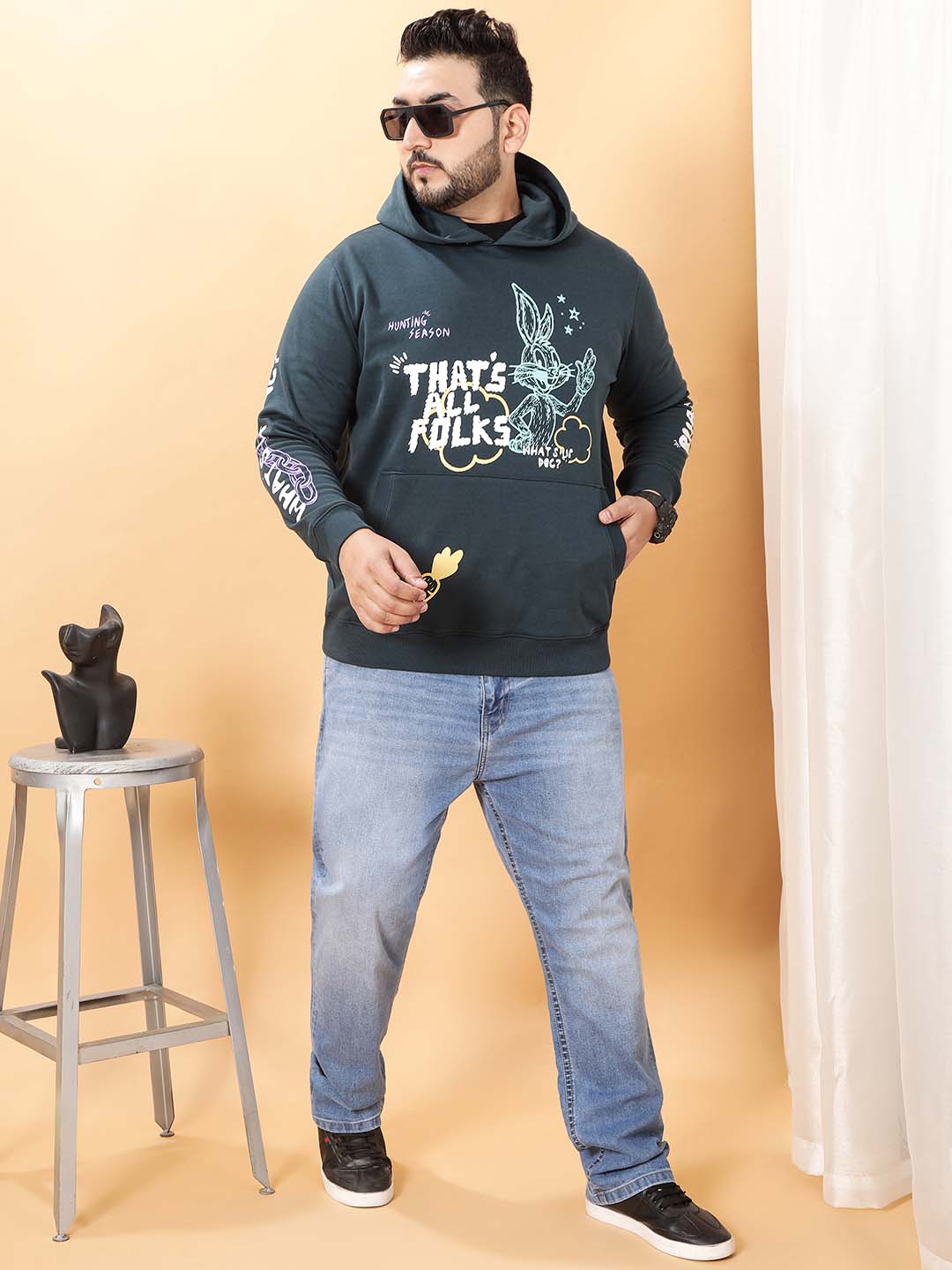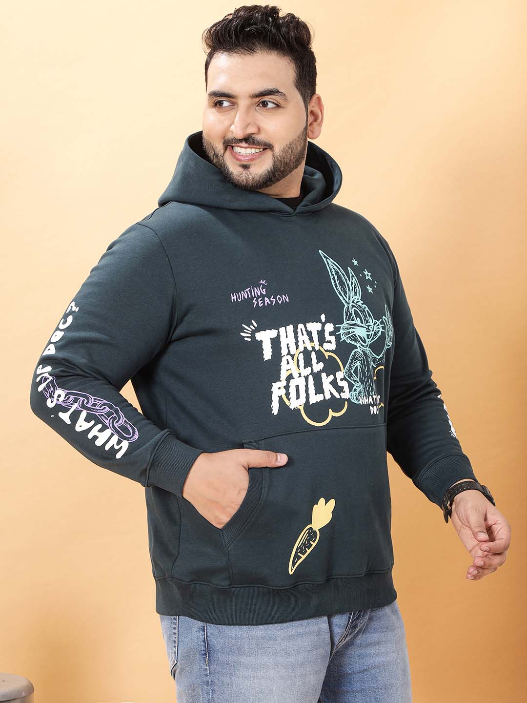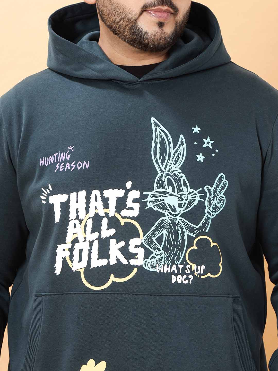 This sweatshirt hoodie is crafted from soft fleece fabric that offers excellent warmth and comfort for casual, everyday wear. The design features an all-over printed graphic with a playful, cartoon-inspired rabbit illustration combined with the iconic phrase "That's All Folks," creating a vibrant and youthful aesthetic. It includes practical kangaroo pockets that blend seamlessly for convenient storage and hand warming without disrupting the sleek look. The ribbed cuffs and bottom hem provide a snug fit, ensuring the garment maintains its shape and stays comfortable during wear. This hoodie perfectly balances bold, fun design elements with functional comfort, making it ideal for those seeking standout style and cozy wearability in their wardrobe.