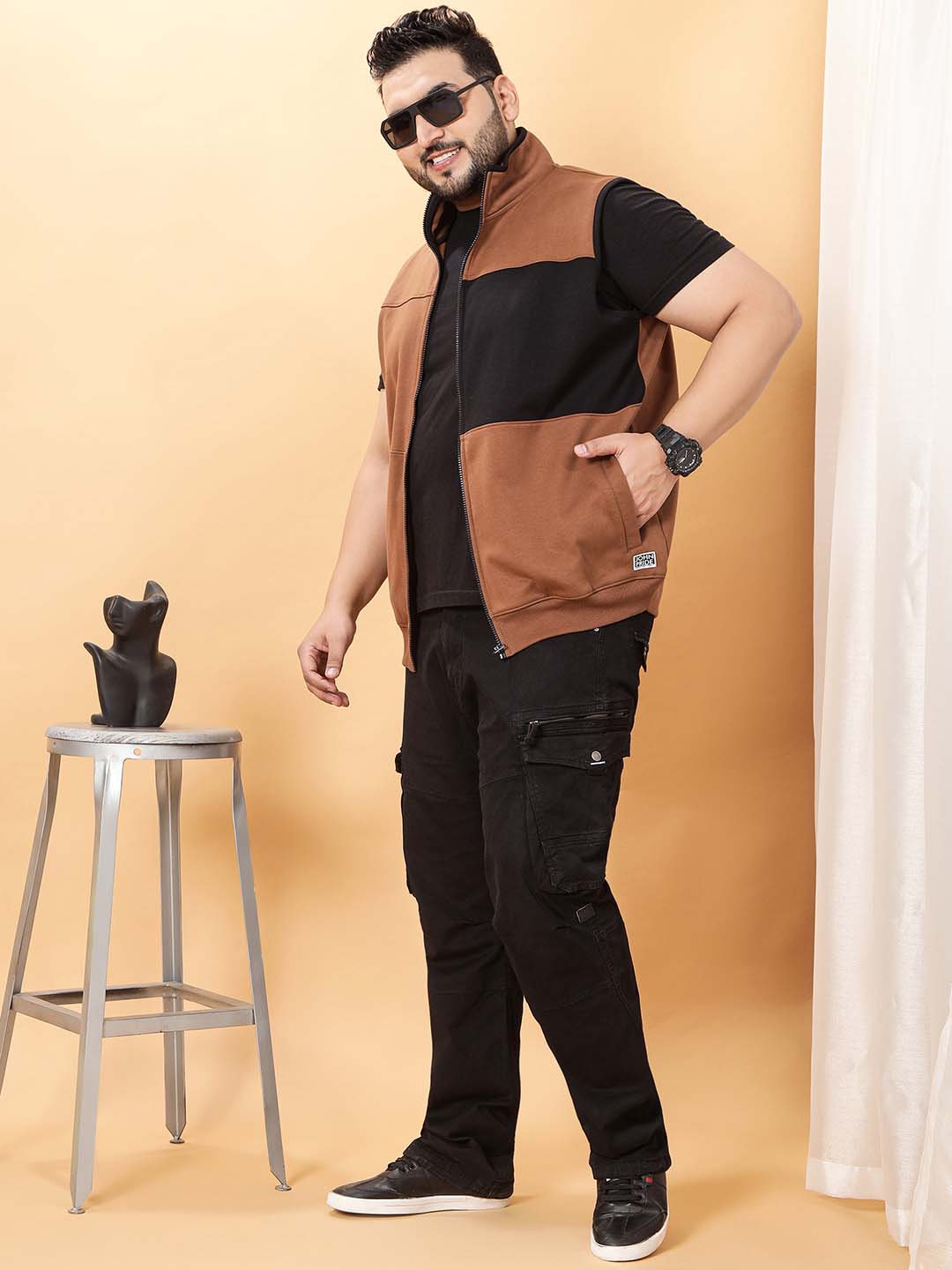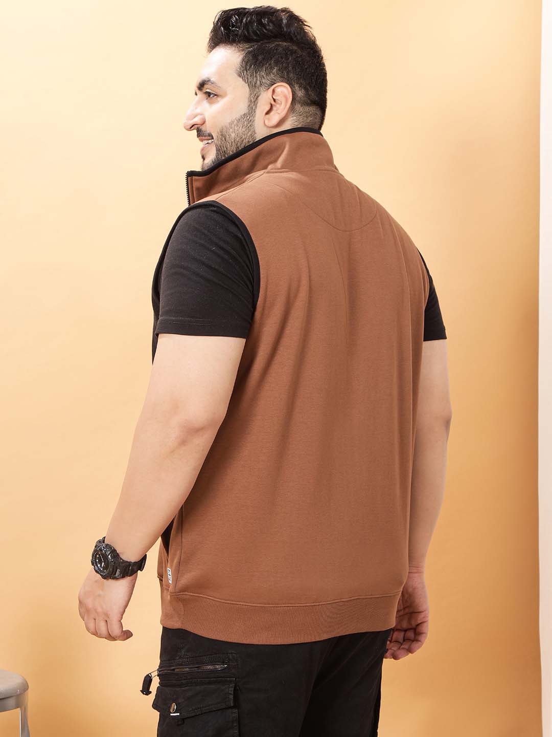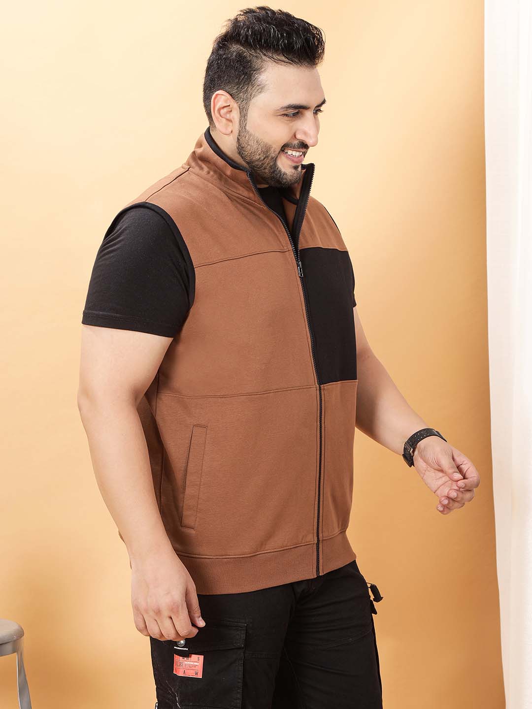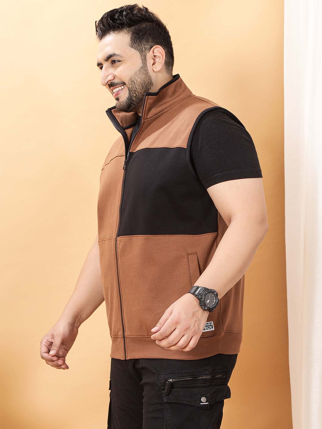 This sleeveless sweatshirst features a bold color-block design made from soft and cozy fleece fabric for all-day warmth. It includes a sturdy black piping zipper for a sleek contrast and smooth functionality. The sweatshirt offers practical bone-colored pockets for convenient storage and style. Its ribbed bottom hem provides a snug fit, ensuring the garment stays in place while maintaining comfort. Perfect for layering or as a standalone piece, this sleeveless sweatshirt combines sporty style with everyday ease.