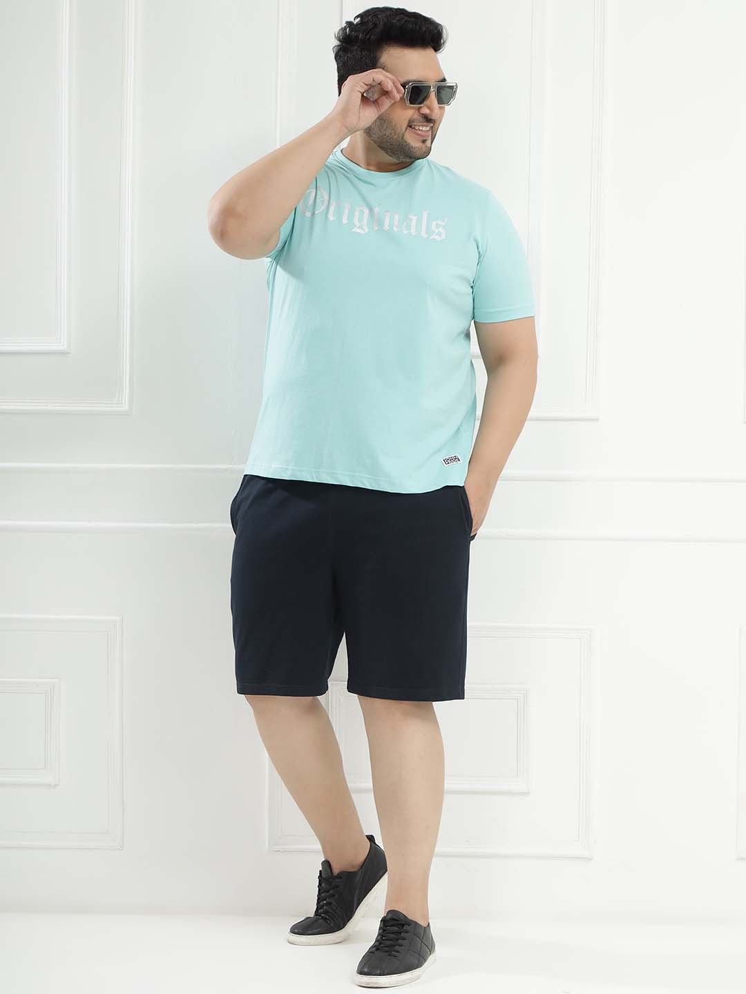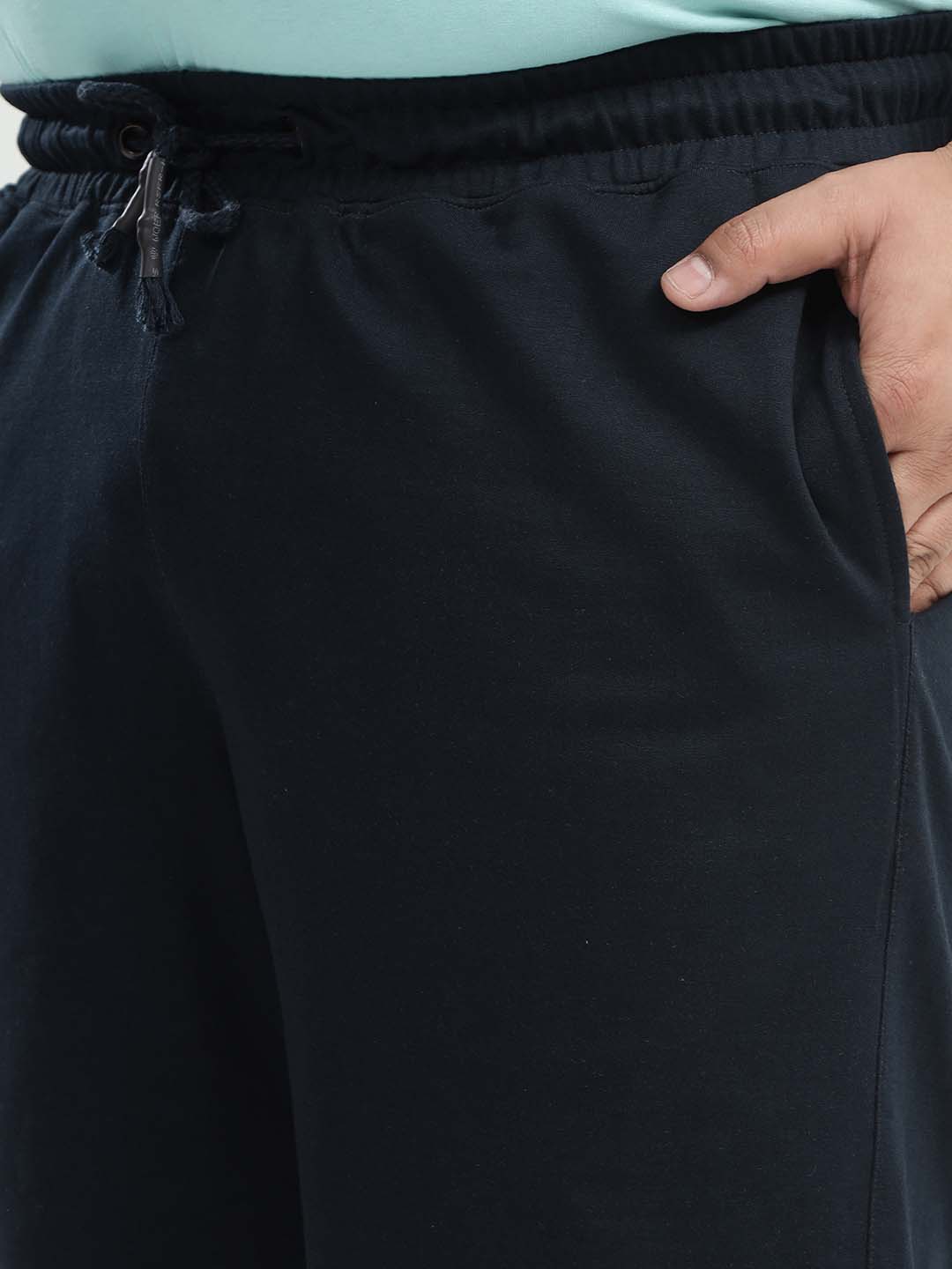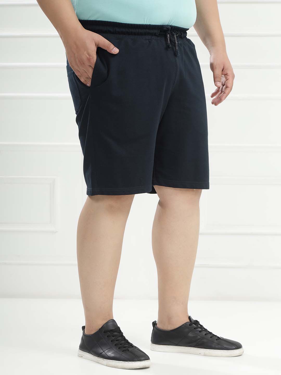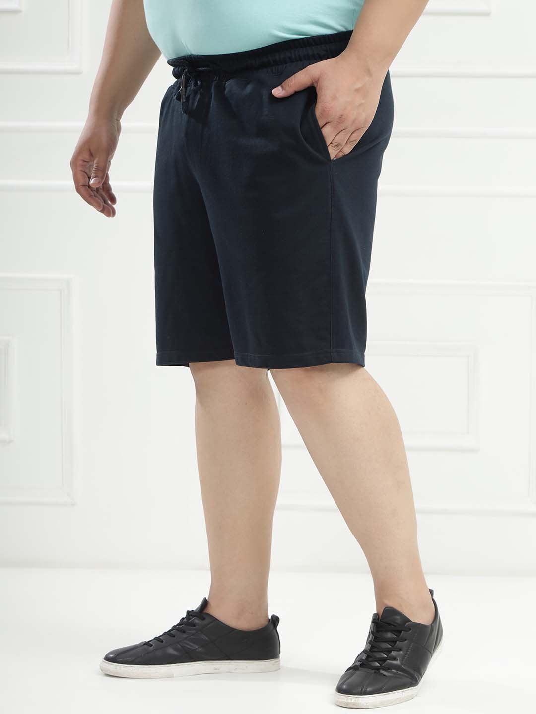Stay effortlessly comfortable with these navy solid knitted cotton shorts, designed for relaxed everyday wear. Featuring an elasticated waistband with an adjustable drawcord, they offer a flexible and secure fit. Crafted from soft knitted cotton fabric, these shorts come with practical front pockets and a single back pocket—perfect for casual days, lounging, or on-the-go comfort.