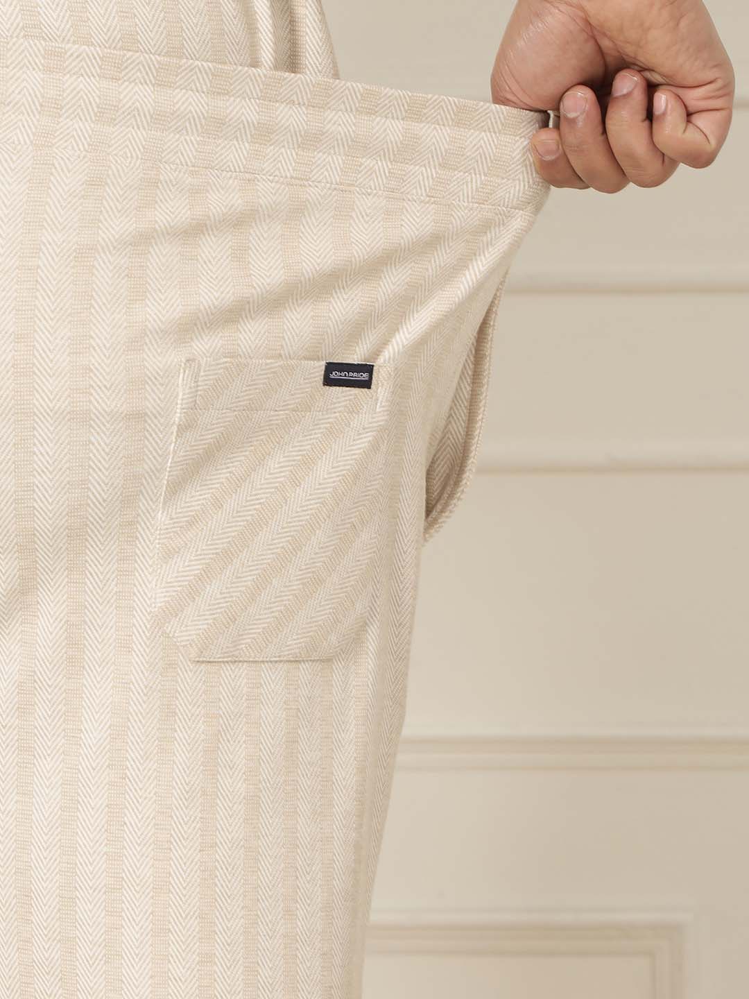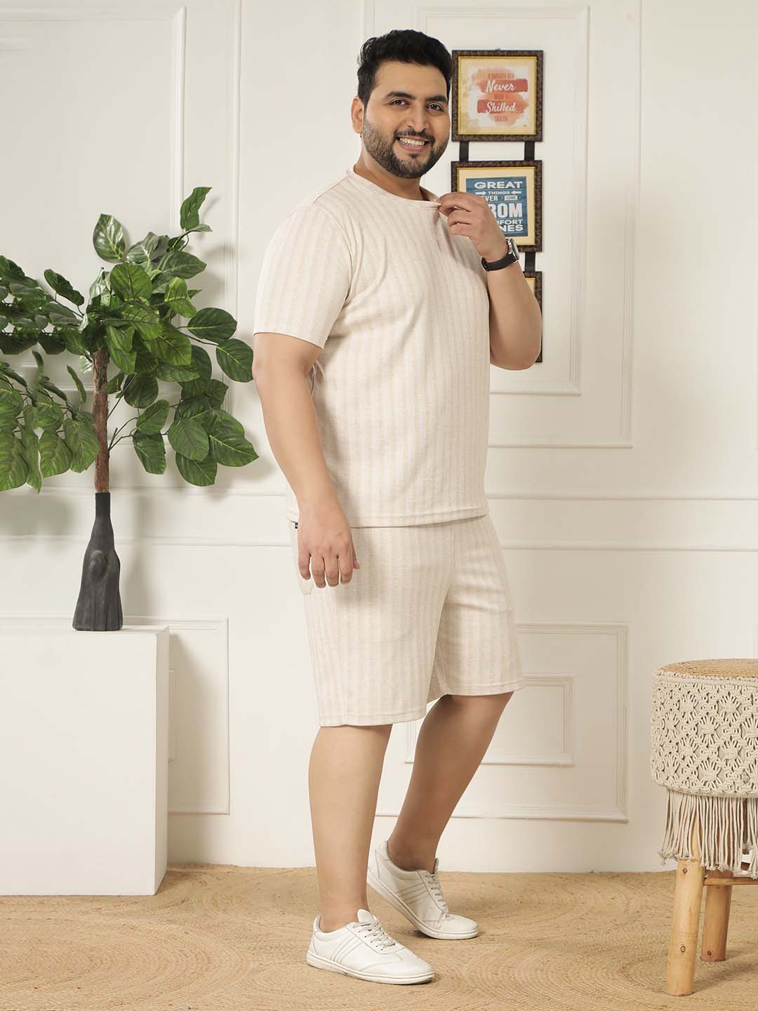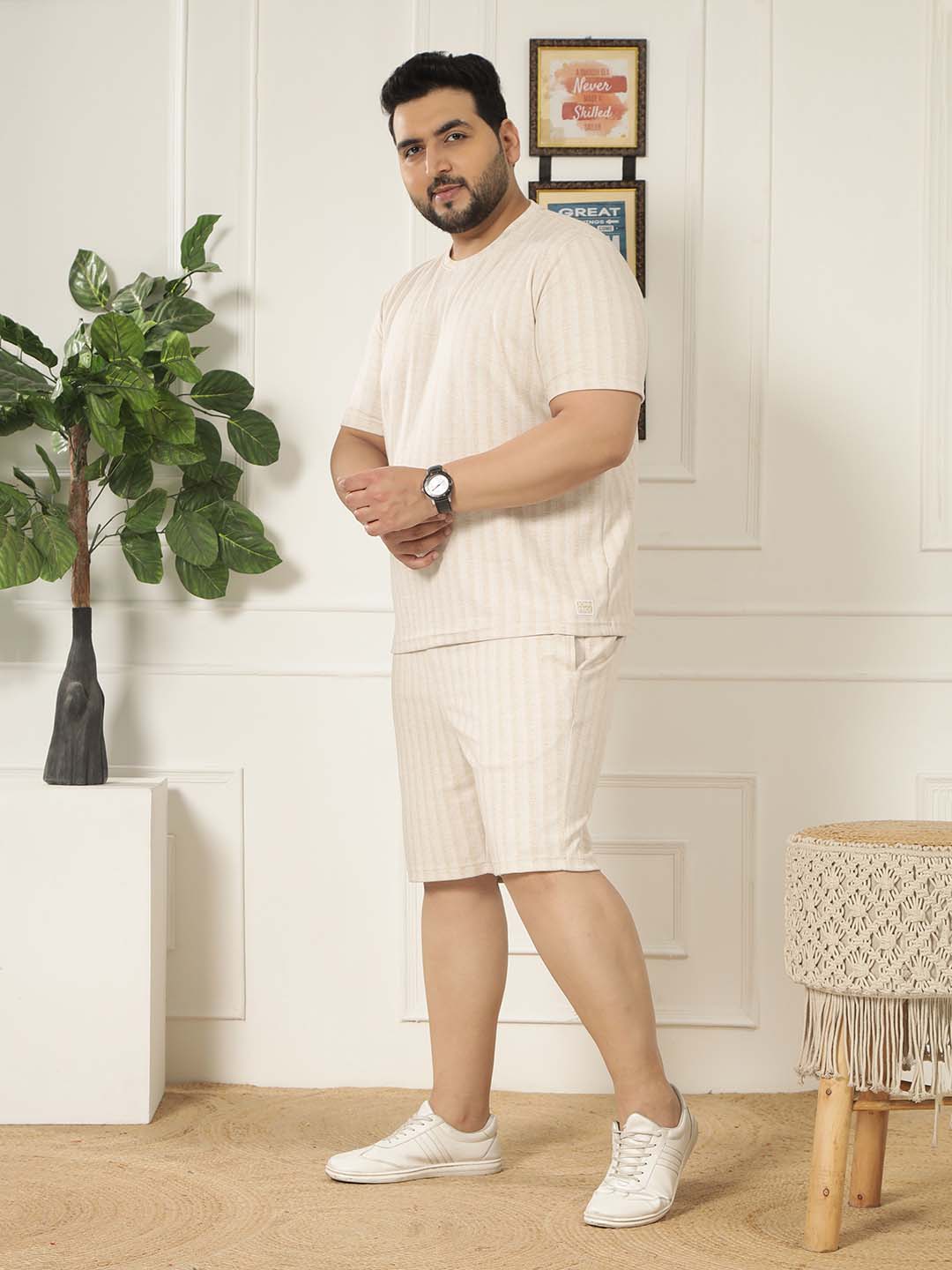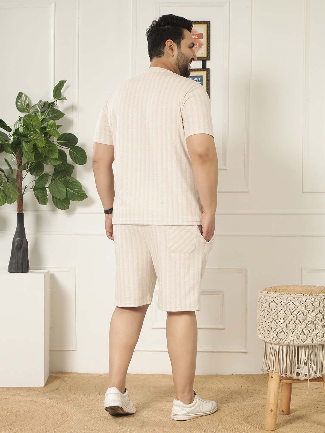 Upgrade your casual wardrobe with the Dune Stripe Co-ord Set, designed for modern comfort with a clean minimal look. Crafted from a premium blend of 97% Cotton and 3% Elastane, the stretchable jacquard fabric provides breathability with added flexibility for all-day ease. The set features a round neck T-shirt paired with matching shorts, highlighted by a subtle vertical stripe jacquard pattern that adds texture and style. The shorts include three functional pockets and an elasticated waistband with adjustable drawcord, making it perfect for casual outings, travel, or relaxed weekends.