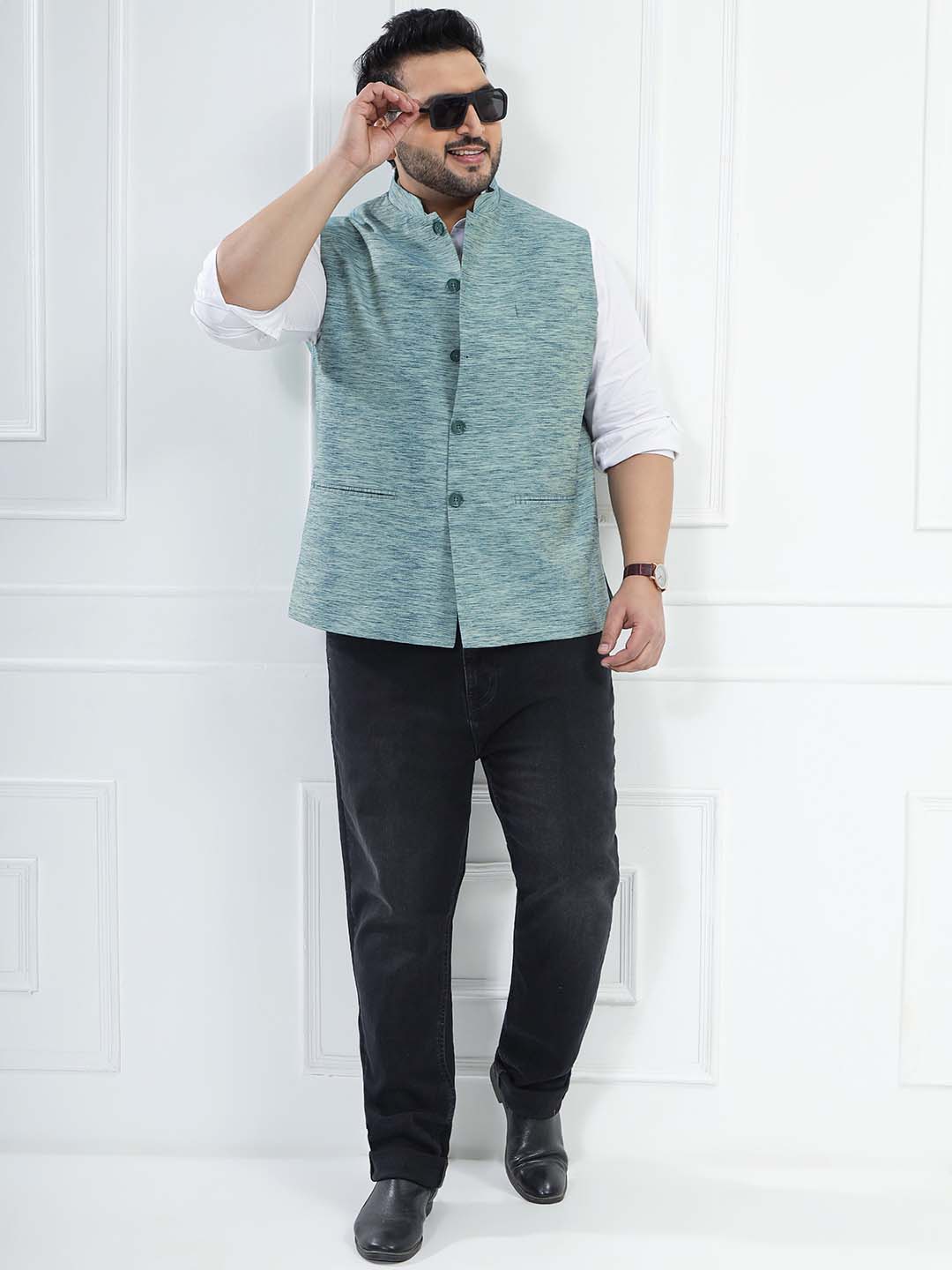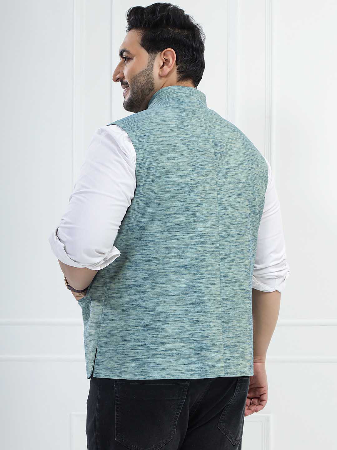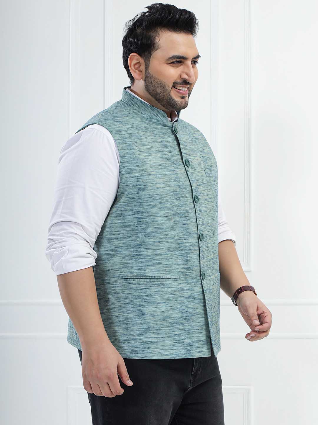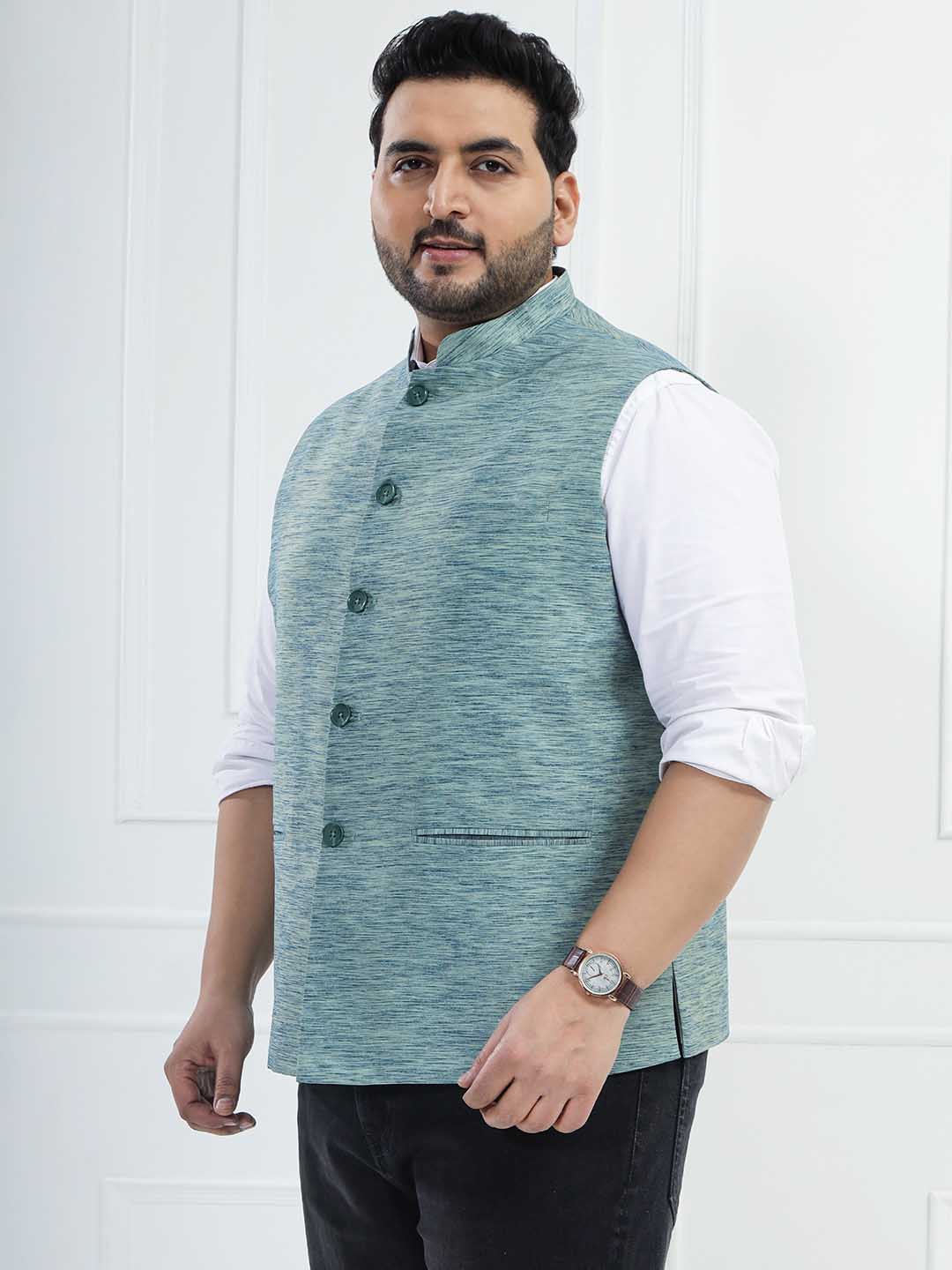 A refined Nehru Jacket in a soft green tone, crafted with a subtle self-design that adds depth and character without overpowering your look. Made from a smooth silk-blend fabric, it delivers a polished texture and a gentle sheen—perfect for festive outings, celebrations, or elegant evenings. Lightweight, classy, and easy to pair with kurta or shirt, this piece elevates traditional style with modern finesse.