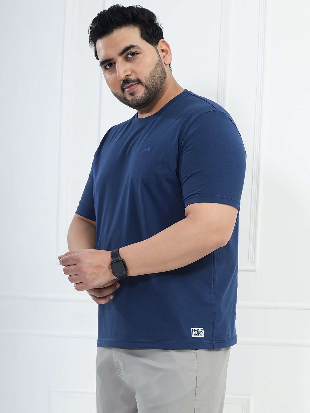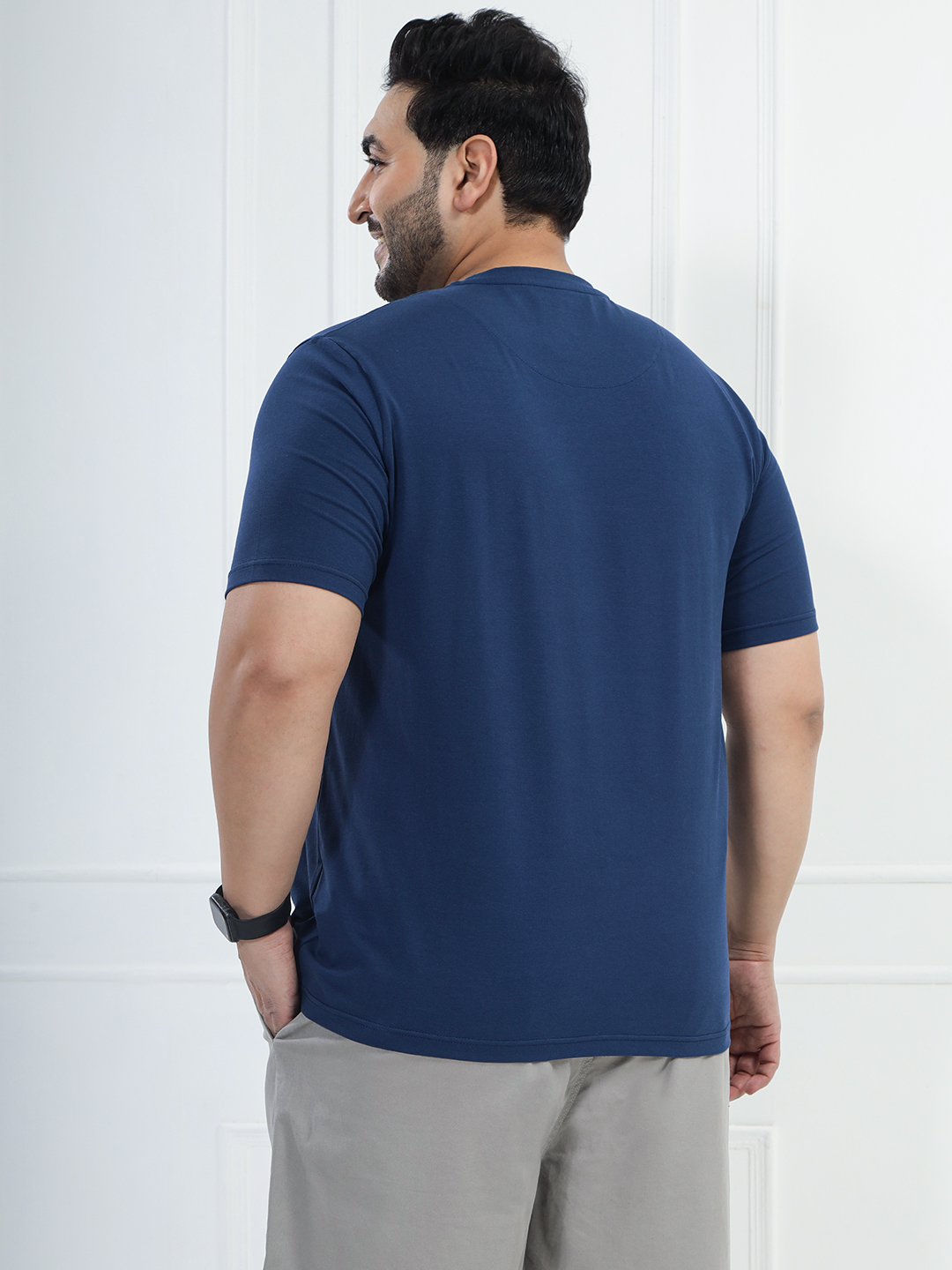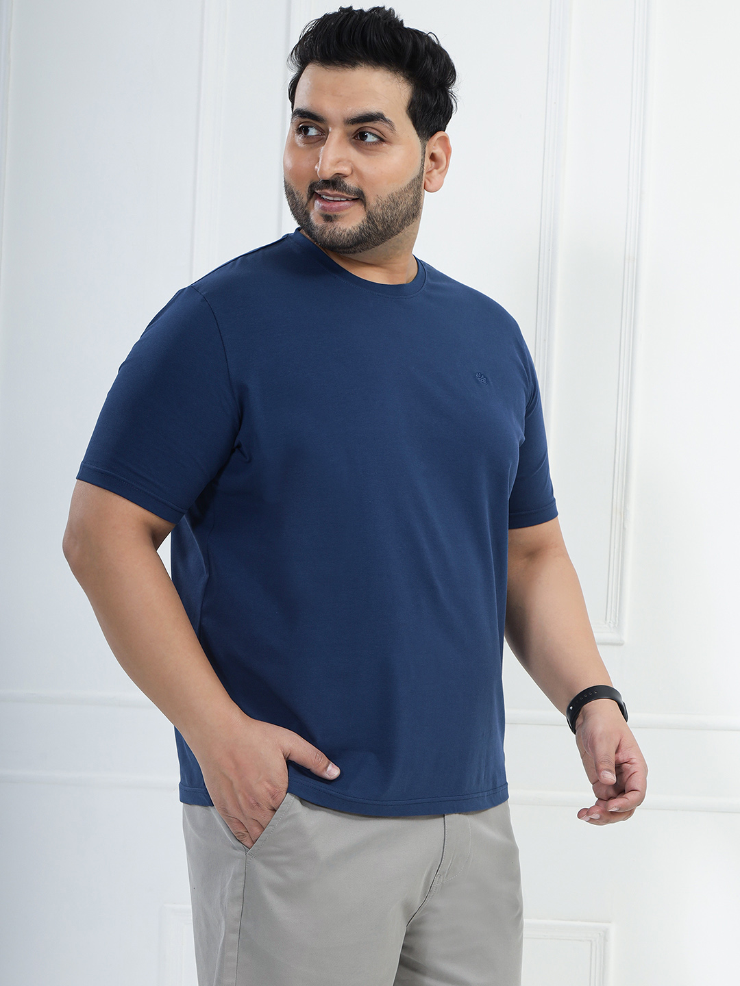 Upgrade your basics with this Men’s Dark Navy Solid Round Neck T-shirt. Made from premium cotton stretch fabric (97% cotton, 3% elastane), it offers a soft feel with flexible comfort and a perfect fit. Ideal for everyday wear, travel, office casual looks, and layering.
