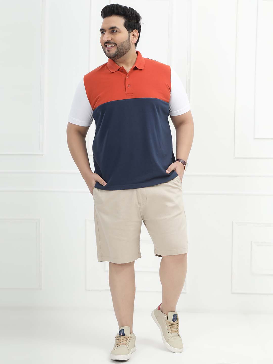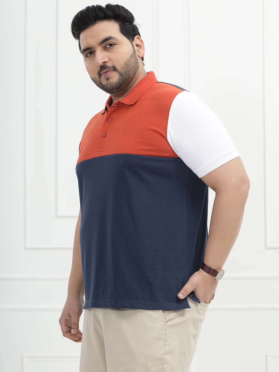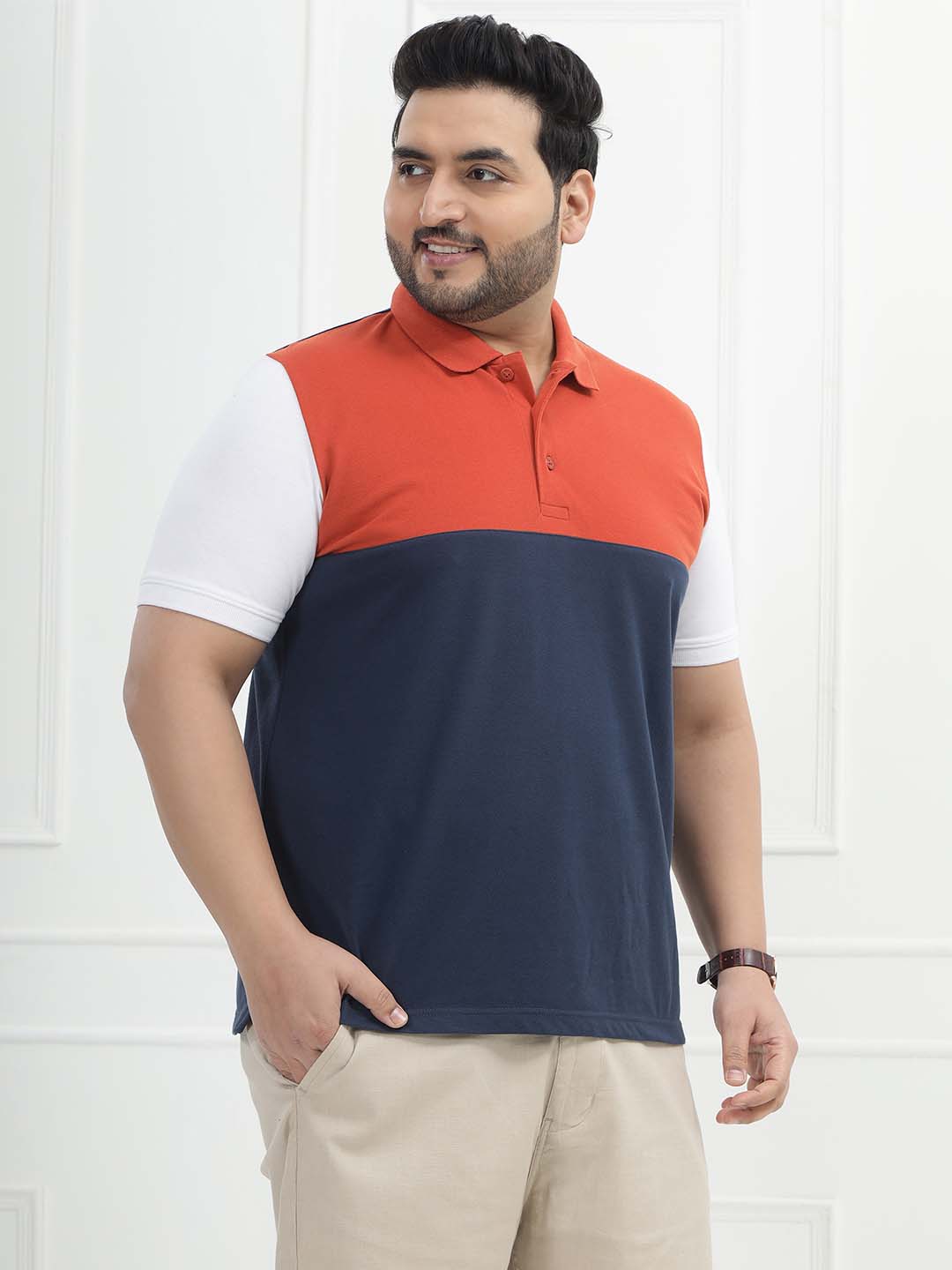 The Triwave Polo features a bold colorblock combination of crisp white, vibrant orange, and deep blue for a fresh and sporty look. Crafted from a comfortable blend of 80% cotton and 20% polyester, it offers breathability with added durability and shape retention. Perfect for casual outings, weekend wear, or smart-casual styling, this polo delivers standout style with all-day comfort.